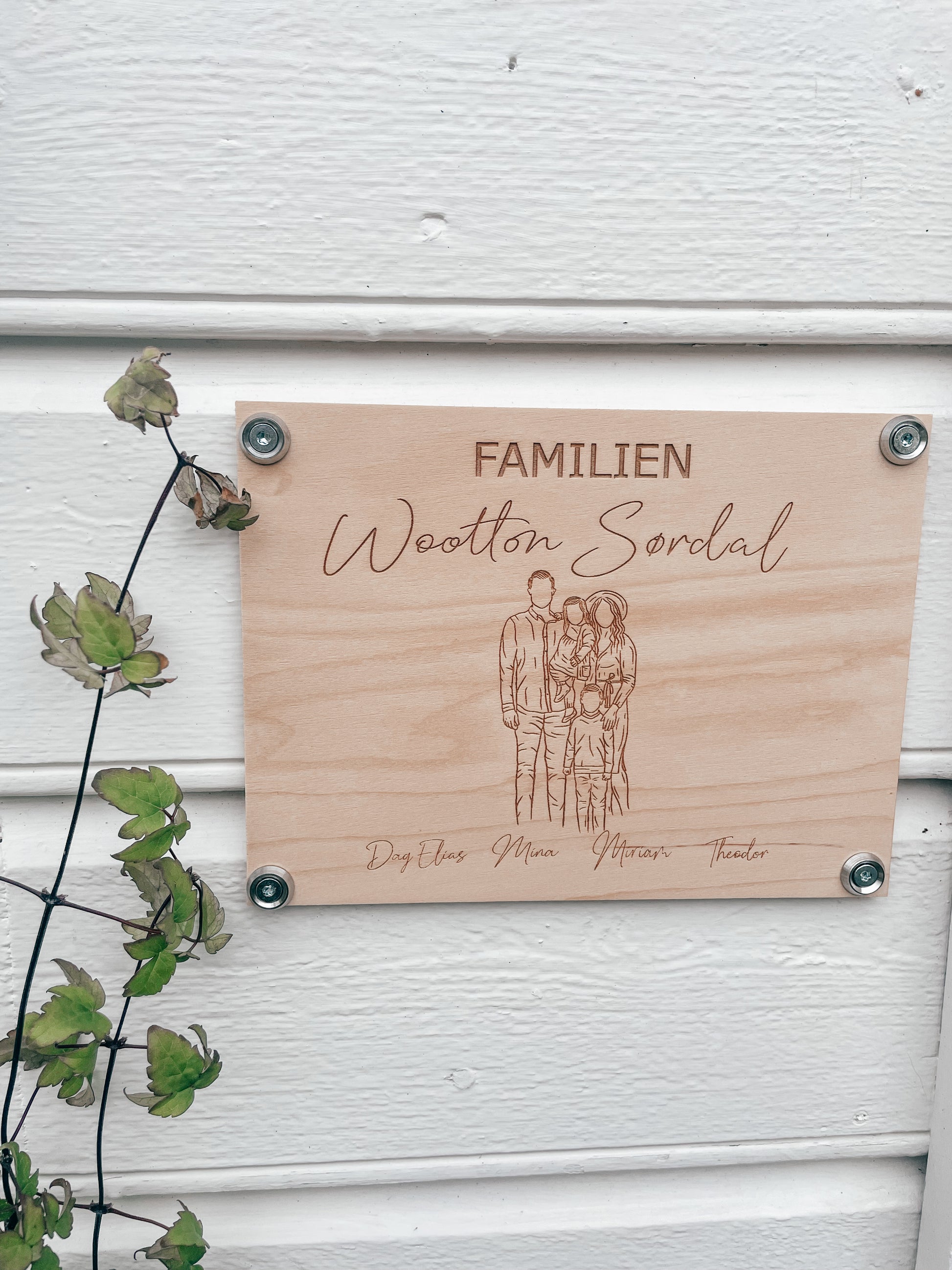 Dørskilt med gravert inn bilde av familien.