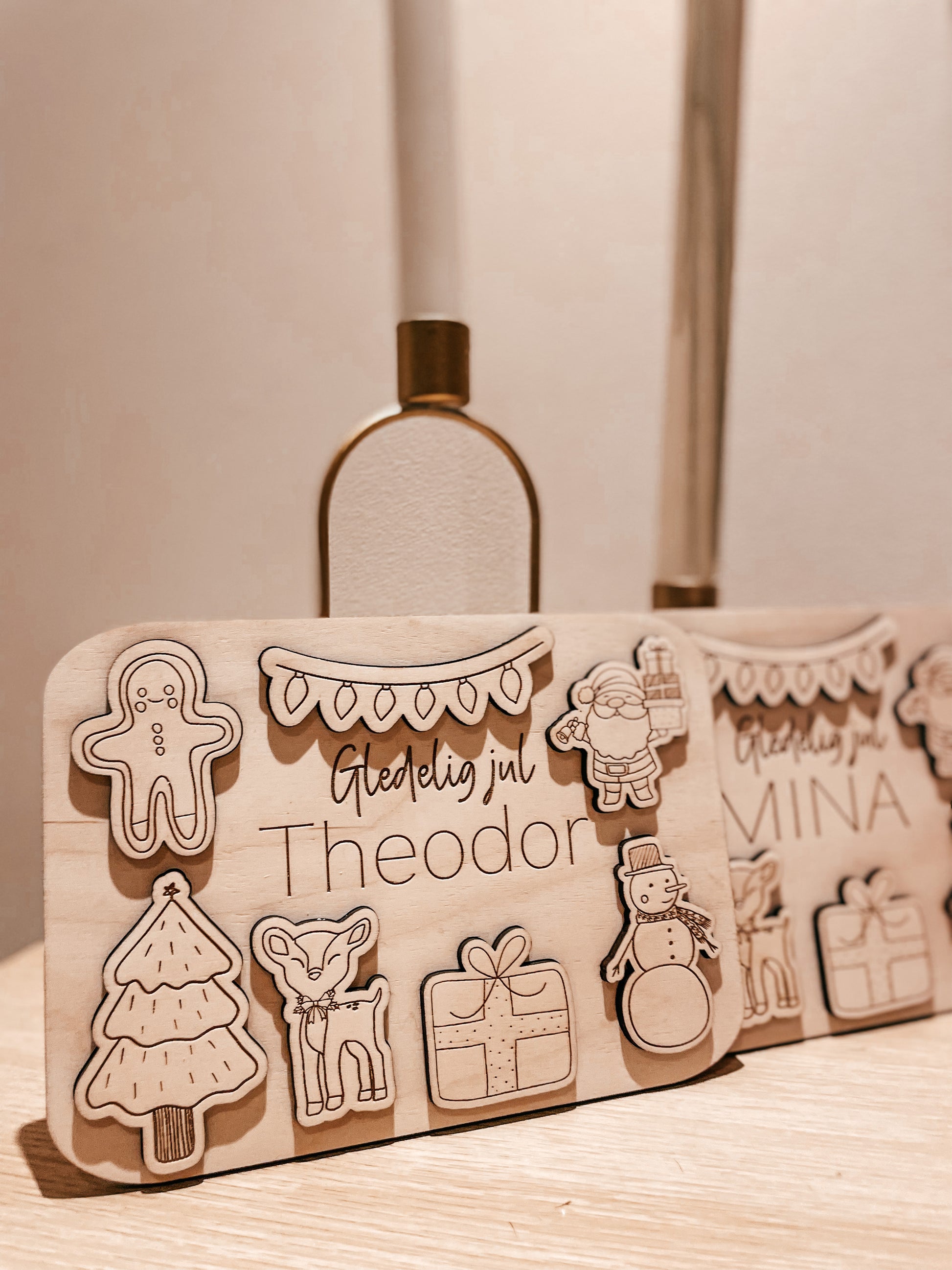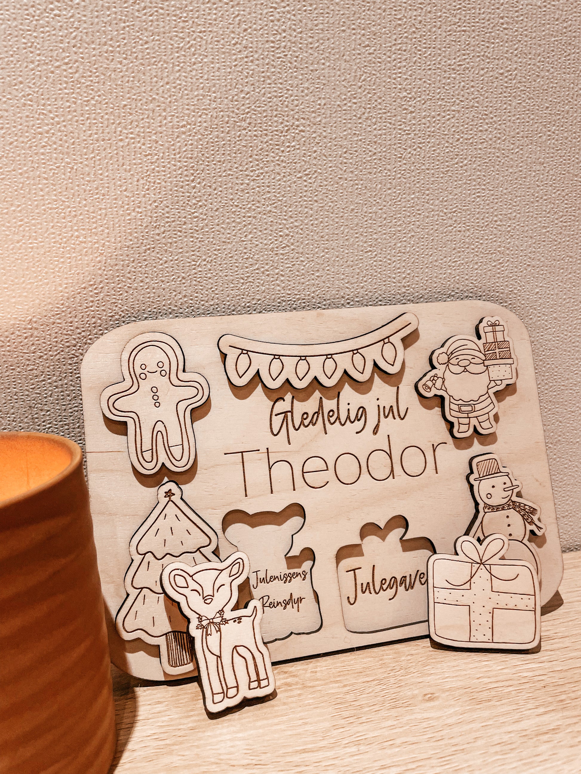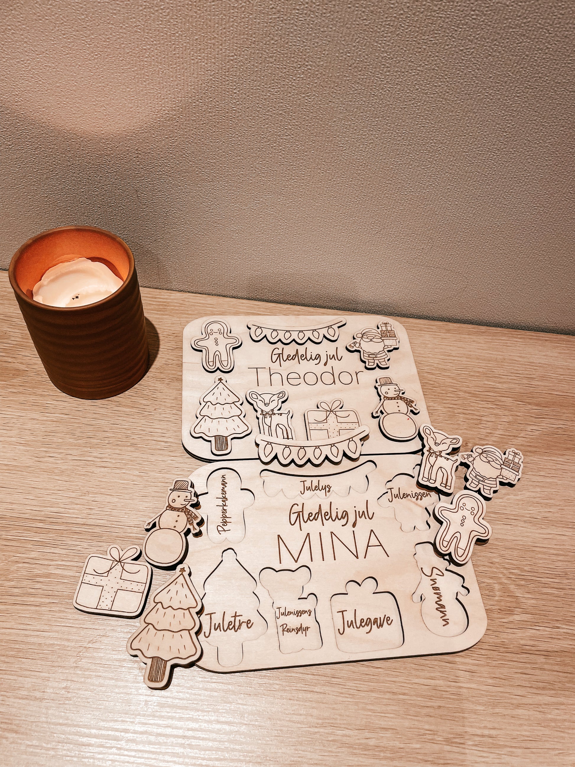 Et nydelig og personlig julepuslespill i tre med valgfritt navn! Perfekt i ei litta adventsgave/førjulsgave som barnet kan bruke gjennom juletiden, og som lett kan taues frem igjen året etterpå! 🤎