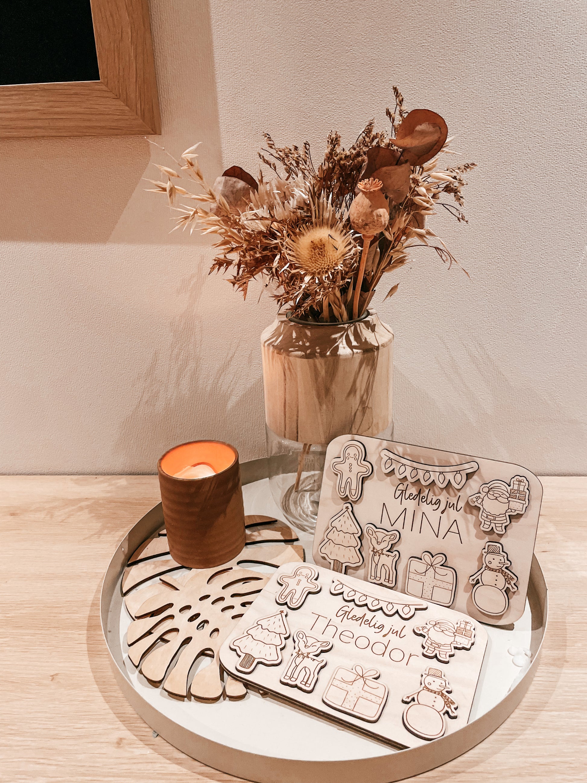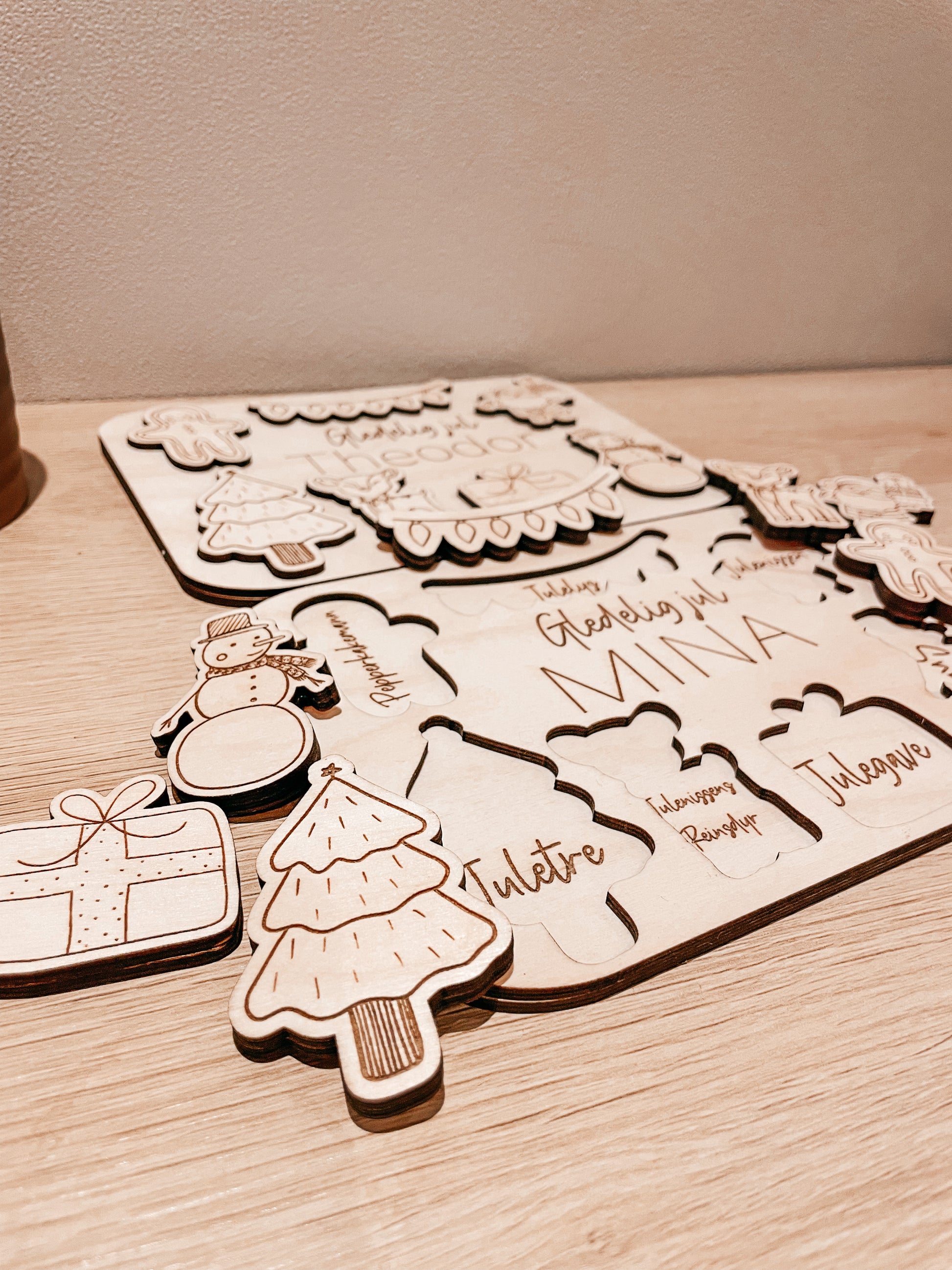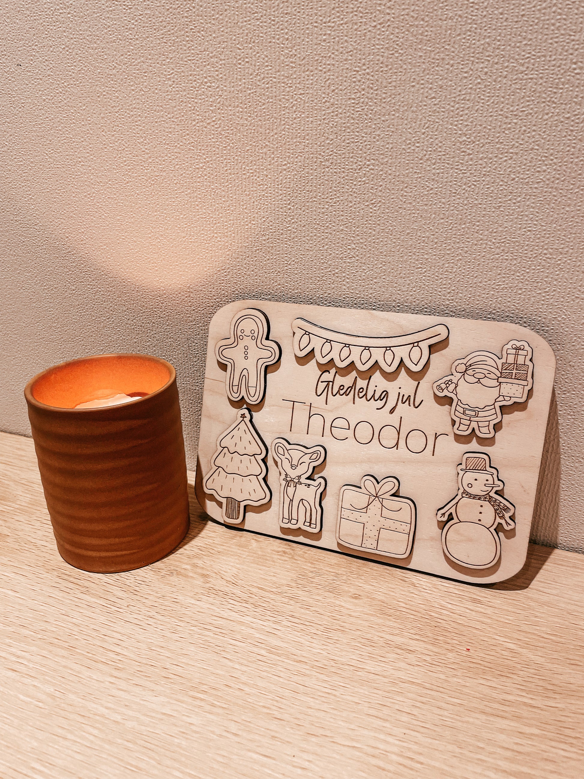 Et nydelig og personlig julepuslespill i tre med valgfritt navn! Perfekt i ei litta adventsgave/førjulsgave som barnet kan bruke gjennom juletiden, og som lett kan taues frem igjen året etterpå! 🤎